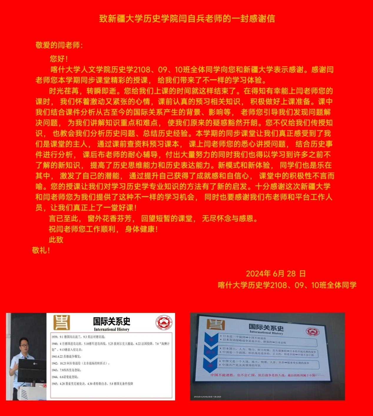 6月28日,为了表达对九九精品视频一区在线久久久久久久久久毛片精品美女|国产99久久久久久免费看|中文精品99久久国产|国产69精品久久久久9999|精品久久久久久中文字幕无码|亚洲熟妇无码久久精品国产精品99|精品国产天堂综合一区在线和授课教师的感谢,喀什大学人文学院历史学2108、09、10班全体同学向闫自兵老师发来诚挚的感谢信。喀什大学人文学院也发来了感谢函,提出“同步课堂使得我院任课教师和学生受益匪浅。课程不仅得到了教师和学生的好评,还调动了教师教学改革的主动性、积极性,进一步关注信息化时代背景下的学生需求。课程应用信息技术创新教学方式,通过‘慕课西行’远程智慧教学,使教学信息更加充分、教学内容更有效。”